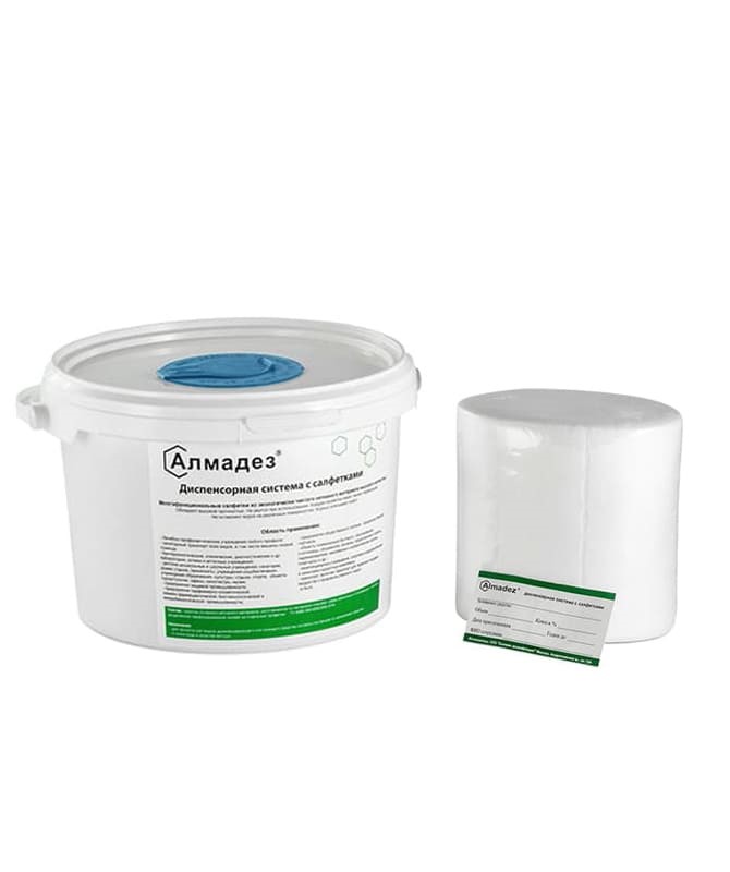 Диспенсерная система с салфетками «Алмадез» используется как в сухом виде в качестве ветоши, так и во влажном состоянии после пропитки раствором дезинфицирующего или моющего средства.