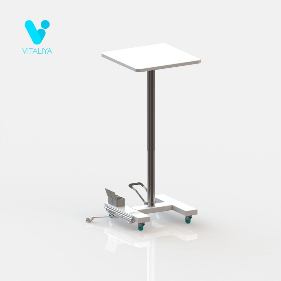 Рабочая поверхность выполнена из постформинга. Регулировка по высоте выполняется за счёт гидравлического подъёмного механизма. На основании стойки расположена одна розетка на два гнезда со шторками. Стойка установлена на колёсные опоры диаметром 50мм, два колеса с тормозом.