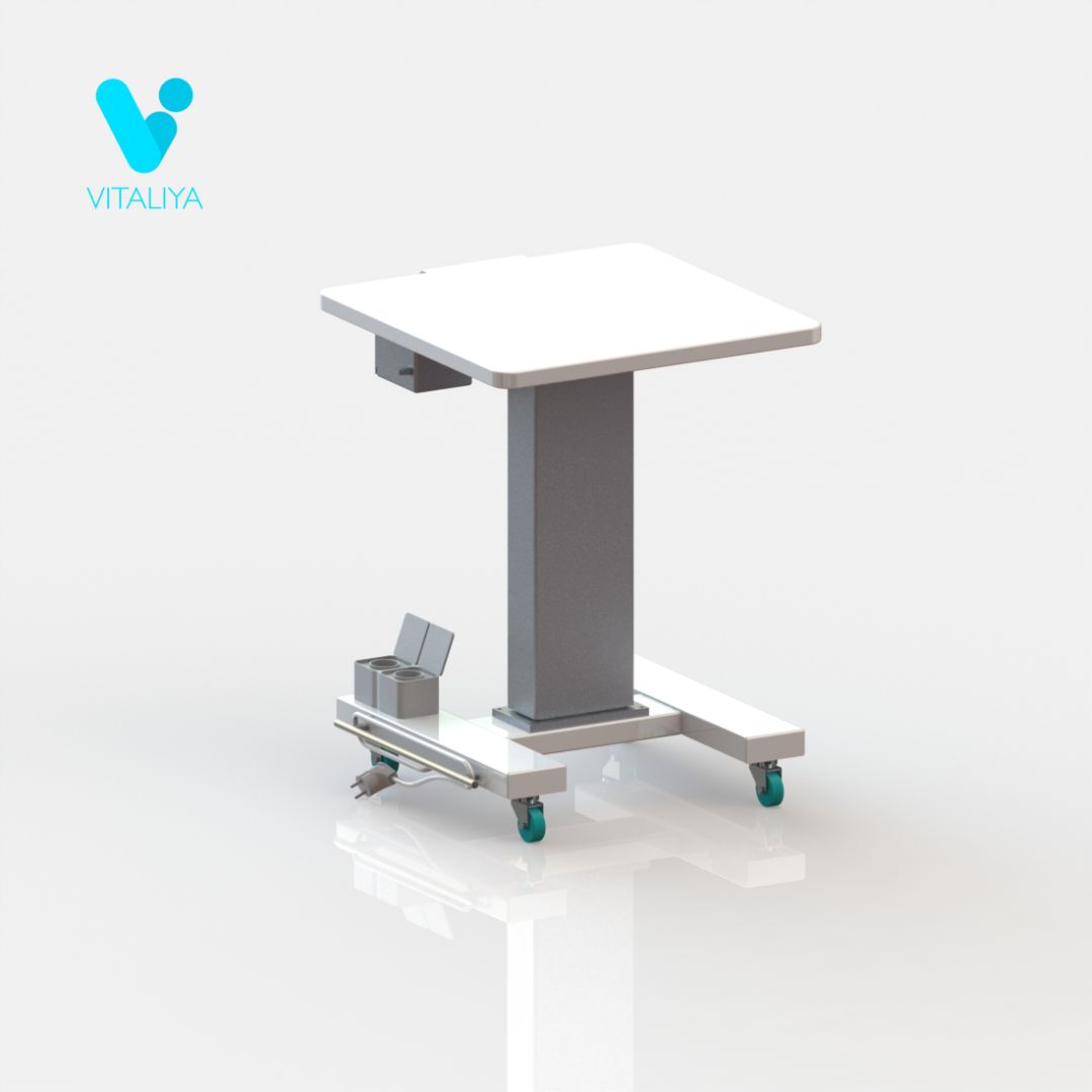 Рабочая поверхность выполнена из постформинга. Регулировка по высоте выполняется за счёт электропривода. На основании стойки расположена одна розетка на два гнезда со шторками. Стойка установлена на колёсные опоры диаметром 50мм, два колеса с тормозом.