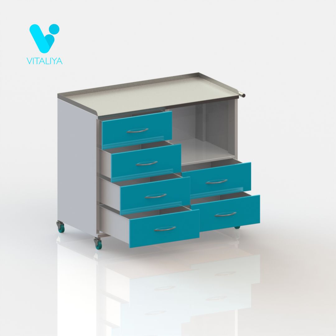 Столик передвижной для анестезиолога с шестью ящиками и нишей. Столешница из нержавеющей стали. Столик установлен на колёса диаметром 75 мм