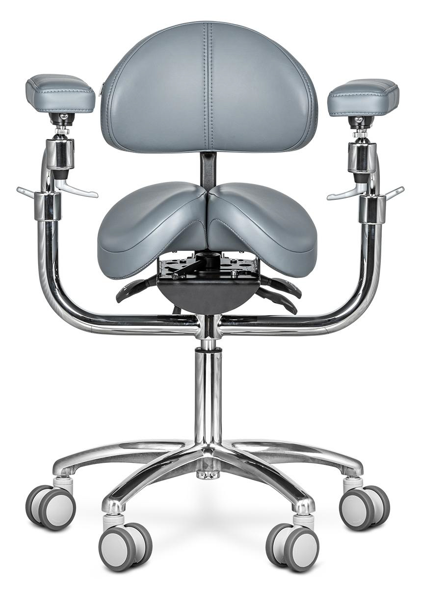 Подлокотники стула имеют очень широкий диапазон регулировки, что позволяет работать с микроскопом с максимальным комфортом. Функция трёхмерной регулировки позволит выставить необходимое положение подлокотников по высоте, горизонтали, а также по кругу. Также подлокотники могут выезжать вперёд.