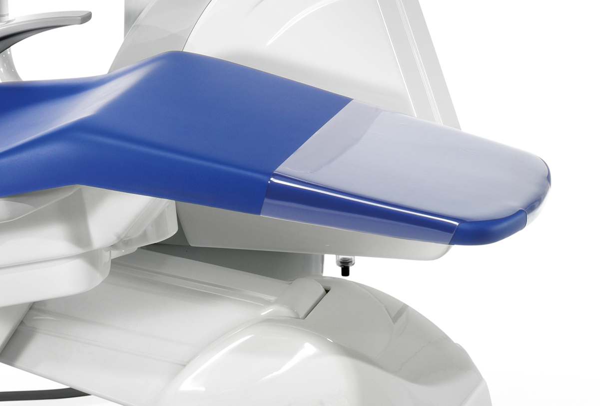 Кресло пациента с электромеханическим приводом, несущее, подголовник с механической блокировкой и артикуляцией по трём осям с возможностью установки для детского приёма, мягкая бесшовная обивка с функцией памяти. Управление креслом с пульта блока врача, либо с педали. Подлокотник с левой стороны кресла.