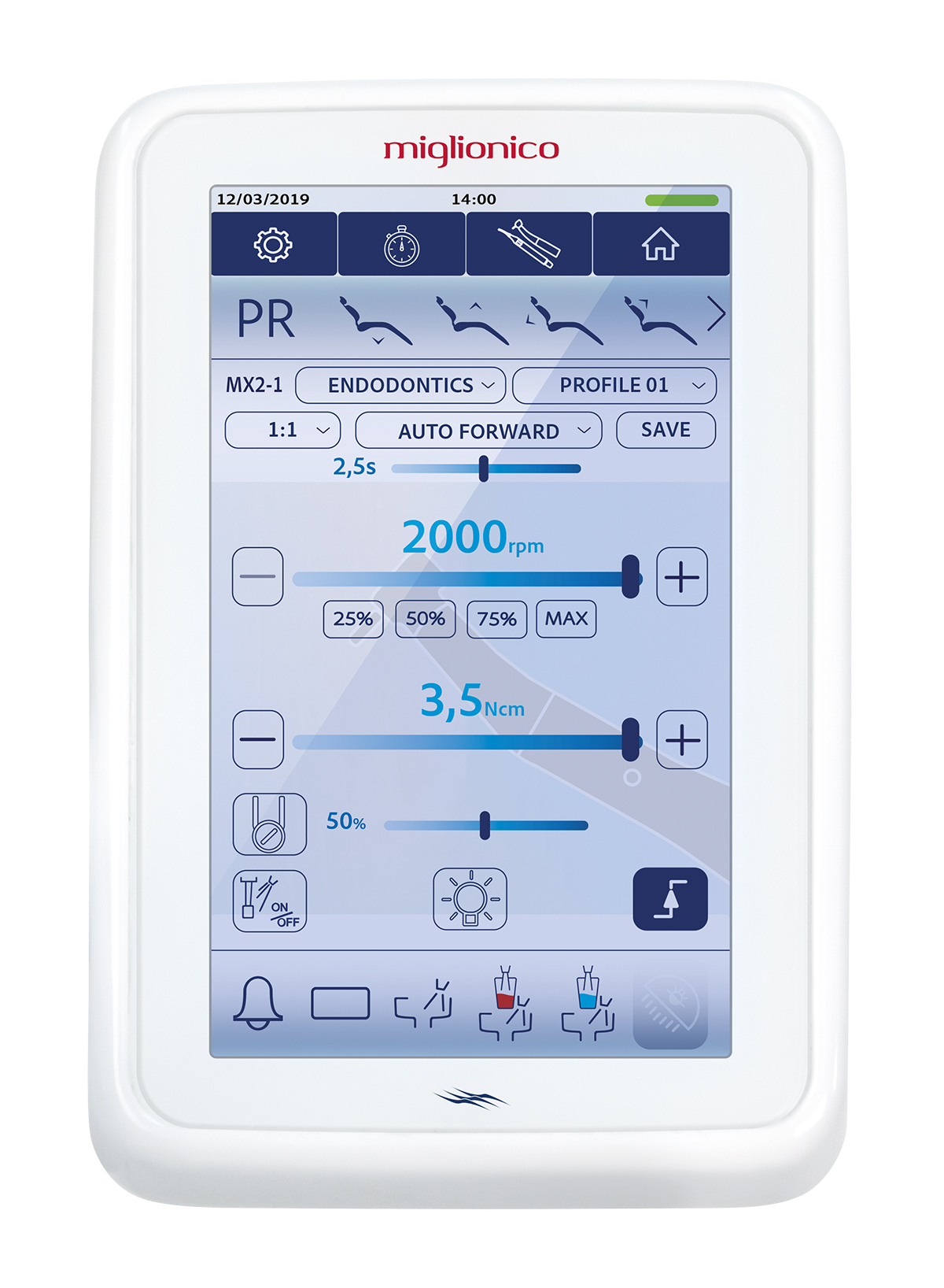 В режиме ЭНДОДОНТИЯ также можно регулировать крутящий момент и установить программы авто реверс/ авто стоп/ авто форвард с обратной регулировкой времени. С активированной программой авто форвард можно использовать функцию CRUISE CONTROL (режим автопилота), которая даёт возможность использовать активный режим микромотора без педали. С этого же экрана можно сохранить выбранные настройки в одной из 10 настроенных программ.