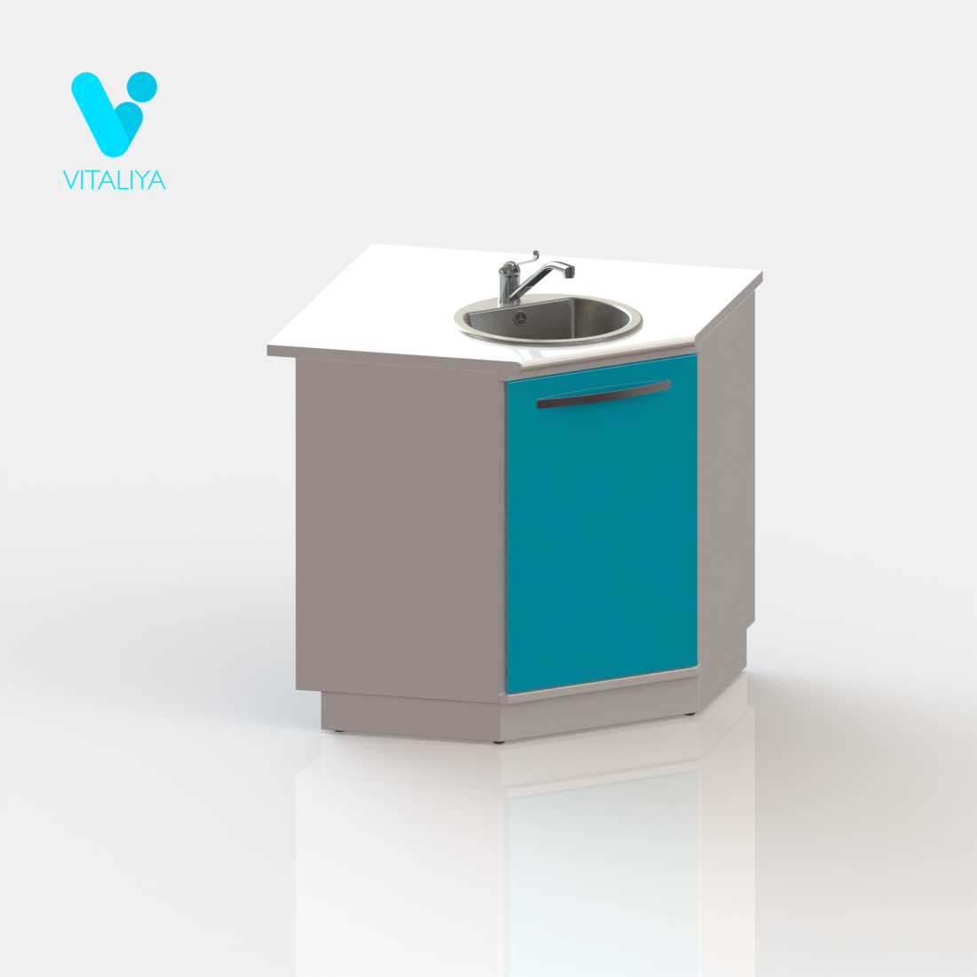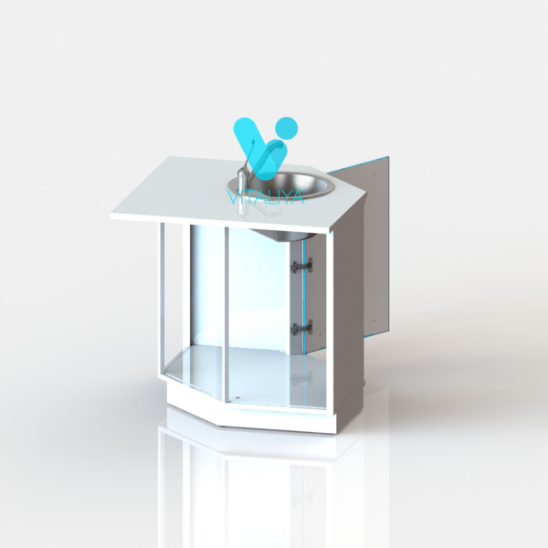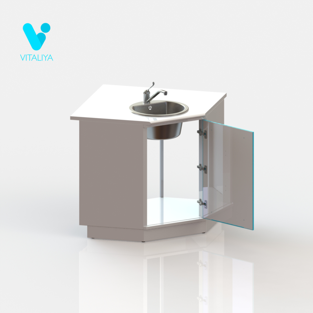 Тумба угловая с дверцей, с вырезом в задней стенке для подвода коммуникаций, оснащена мойкой из нержавеющей стали, локтевым смесителем, сифоном.