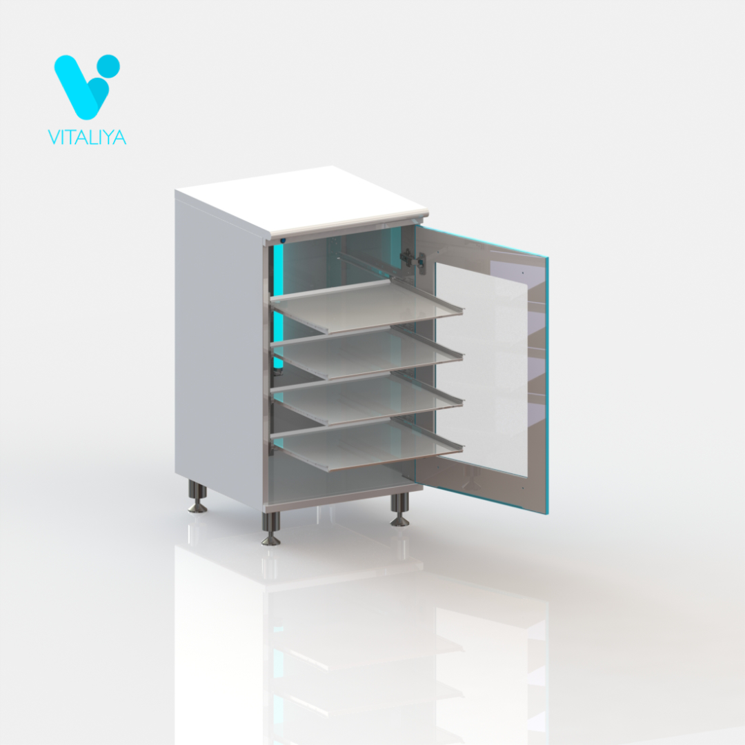 Тумба бактерицидная с 4 выдвижными металлическими полочками, оснащена двумя лампами TUV-15 PHILIPS. Цена указана без учёта столешницы.