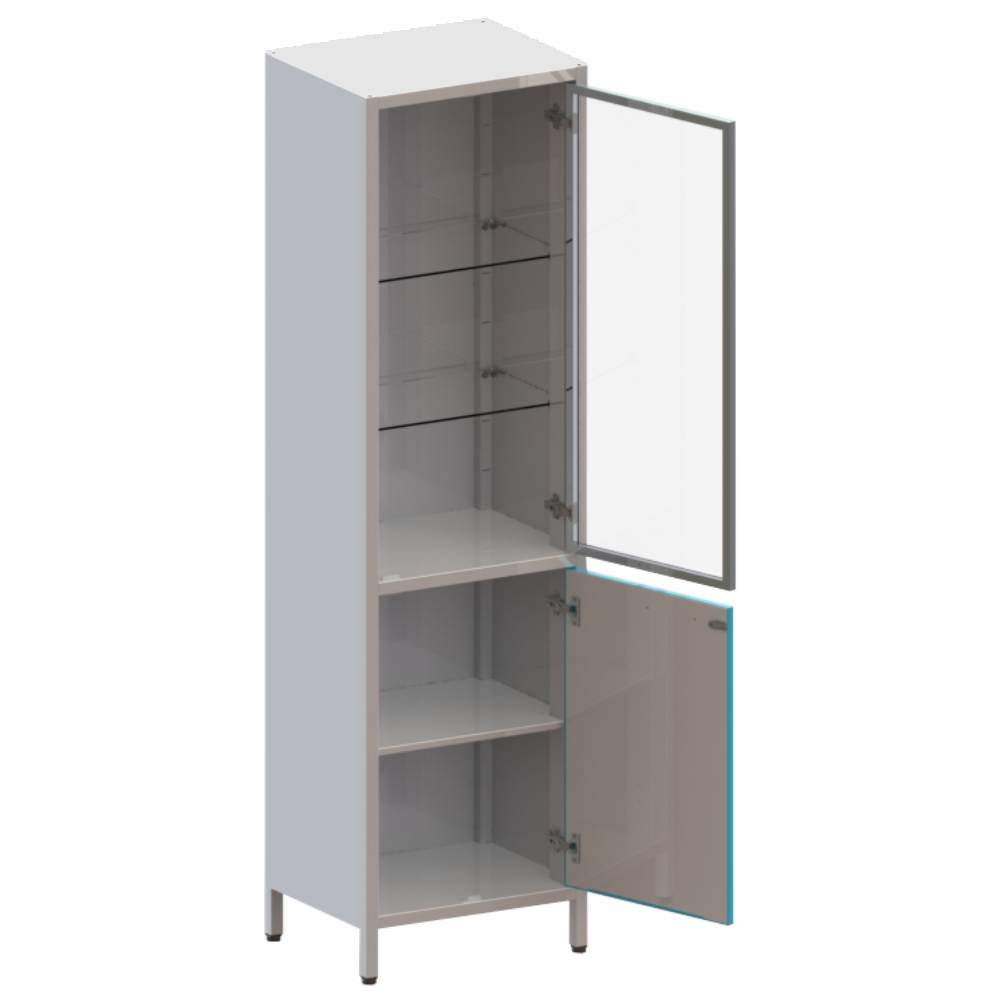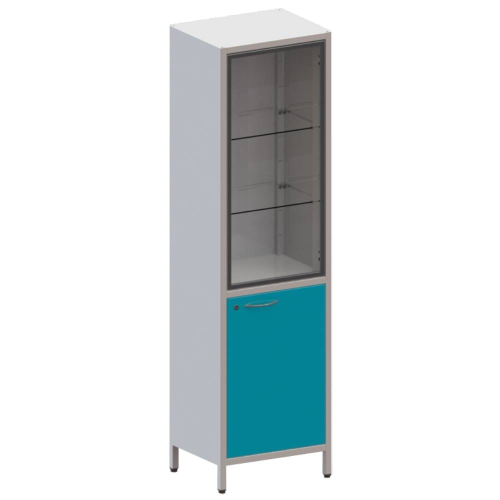 Шкаф одностворчатый на ножках, верхняя секция с дверцей из стекла в алюминиевом профиле и 2-мя стеклянными полками, регулируемыми по высоте. Нижняя секция с металлической дверцей с замком и металлической полкой.
